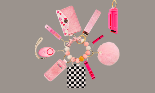 This all-in-one set includes a beaded wristlet strap, fluffy pom pom charm, convenient credit card puller, and a personal alarm for everyday use.